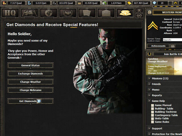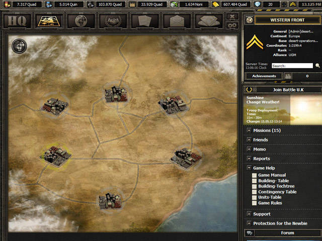 In „Desert Operations“ stehst du als Kommandant deiner eigenen Militärbasis im Krisengebiet zahlreichen Gegnern gegenüber. Hier hilft dir nur dein strategisches Genie, um dich gegen heimtückische Angriffe zu schützen. Gründe also starke Bündnisse zu anderen Spielern, betreibe Handel und erweitere deinen militärischen Einfluss: Nur so kannst du in dem kostenlosen Online Spiel „Desert Operations“ deine militärische Vorherrschaft behaupten. Das Spiel bietet dir durch zahlreiche, technische Features und spannende Quests jede Menge Spaß und Abwechslung. Als klassisches „Free 2 Play Online Game“, ist Desert Operations für dich kostenlos spielbar. An die Front Soldat!